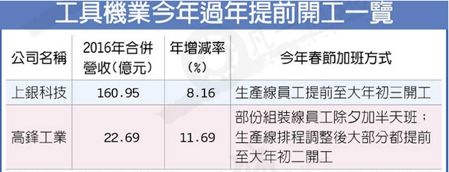 臺(tái)灣工具機(jī)業(yè)過(guò)去幾年包括上銀科技、程泰、亞崴、臺(tái)中精機(jī)、永進(jìn)、友嘉、遠(yuǎn)東機(jī)械、東臺(tái)、臺(tái)灣瀧澤科技及高鋒等工具機(jī)廠及零件業(yè),為了趕急單,即使遇到過(guò)年生產(chǎn)線也照樣排班不停工;但今年一例一休上路,員工加班不單要支付2倍薪資,零件業(yè)僅上銀及大銀微系統(tǒng)加班趕工,工具機(jī)廠目前也僅高鋒提前開(kāi)工,其他廠商普遍選擇大年初六恢復(fù)上班,年節(jié)提前開(kāi)工不如往年熱絡(luò)。