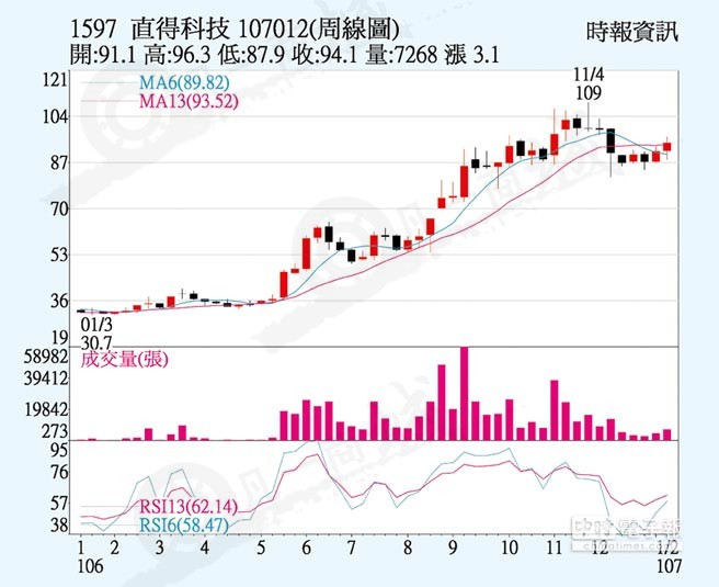 直得科技(CPC)去年因半導體、面板及光電等產業對智慧自動化及機器人需求殷切而受惠,去年合并營收逼近15億元,改寫歷史新高,市場預期CPC今年產能擴增2、3成,營收及獲利可創新高,上周股價上漲5.5元而以94.1元收盤,周漲幅3.41%。