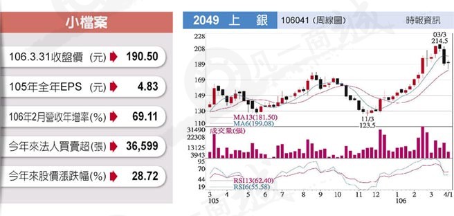上銀科技(2049)今年對上銀滾珠螺桿、上銀直線導軌及機器人三大主力產品需求增溫,從去年第1季末到第2季初旺到現在,上半年訂單滿爆,生產線加班趕工,1至2月合并營收26.98億元,年增45.95%,擔心工具機廠重復下單,下半年轉趨謹慎,務實接單,全年合并營收有機會續創新高。
