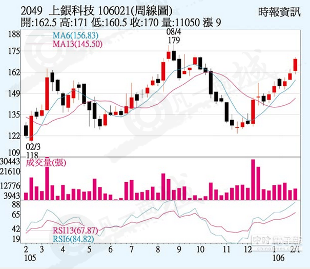 上銀大廠(2049)因滾珠螺桿、直線導(dǎo)軌及機(jī)器人三大主力產(chǎn)品,17年首季訂單因大陸對(duì)智慧自動(dòng)化設(shè)備及機(jī)器人需求增溫而滿載,開(kāi)始接第2季訂單,今年合并營(yíng)收要挑戰(zhàn)200億元目標(biāo),上周五三大法人聯(lián)手買(mǎi)超1,599張,股價(jià)上漲7.5元、收170元,周漲幅5.59%。