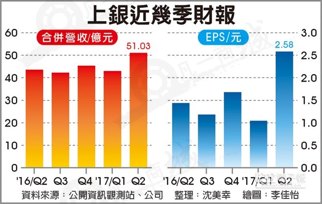 上銀董事會承認(rèn)上半年財報,第2季合并營收51.03億元,營業(yè)毛利17.46億元,毛利率從去年同期的34.19%提高至34.23%,主要是產(chǎn)能利用率提升及第2季產(chǎn)品漲價,加上認(rèn)列1.3億元匯兌收益,推升稅前凈利至8.31億元、稅后凈利6.29億元,EPS從去年同期的1.44元回升至2.58元,季增148.08%,年增79.17%。