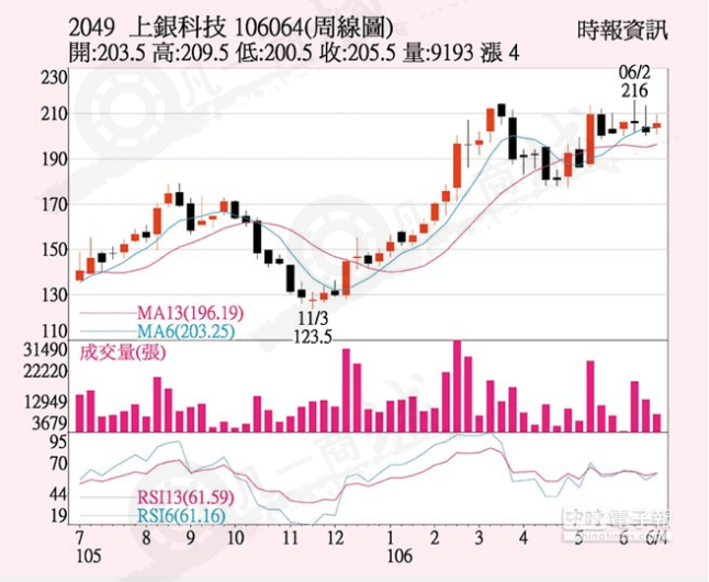 上銀(2049)滾珠絲桿、直線導軌及機器人三大主力商品年底前訂單滿載,法人預期,第2季合并營收挑戰50億元,6月新臺幣匯率回貶,第2季營收及獲利可望優于第1季,三大法人上周五合計買超397張,激勵股價上漲1元、收205.5元,單周漲幅1.99%。