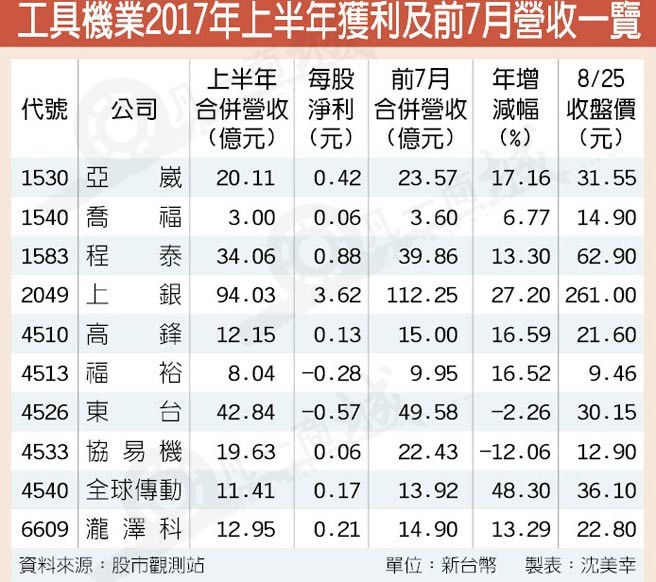 工具機接單持續好轉,反映在下半年及獲利上,亞崴、程泰、上銀科技(hiwin)及東臺等大廠訂單能見度雖看到年底甚至明年首季,仍以集團型態參加9月18日在德國漢諾威登場兩年一度歐洲工具機展爭取訂單,增添營運動能。