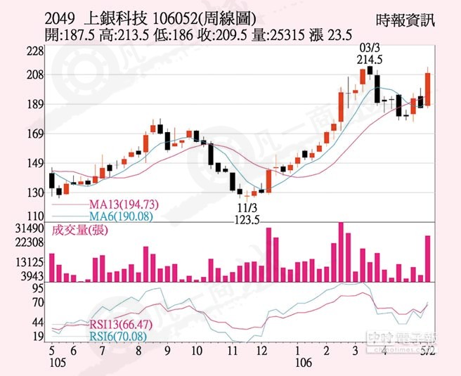 直線導軌及機器人三大主力產品訂單爆滿,今年底前產線滿載,4月突破16億元創單月新高,微創手術機器人6月可望取得認證,年底前開賣,三大法人上周五合計買超1,186張,上漲5.5元而以209.5元作收,股價創近2個月新高,周漲幅12.63%。